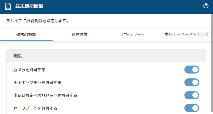 専用端末化以外にも、カメラ機能の停止、USBファイル転送を無効、SDカードのマウント無効などセキュリティに特化した端末機能制限が可能です。