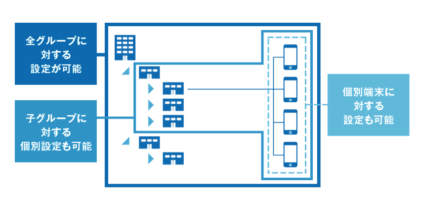 グループに対する設定や端末ごとの設定など、ポリシー適用の範囲に自由度が増し、手間のない管理が実現できます。