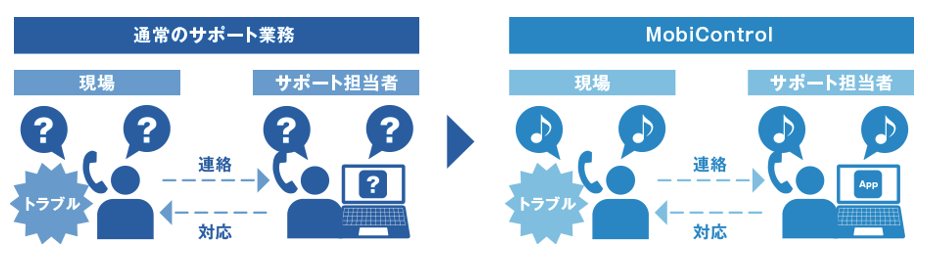端末のサポート業務を行う側と、モバイルデバイスを使用している現場の距離が離れている場合、端末にトラブルや不具合が起こっても電話のみでサポートするのは非常に困難です。
