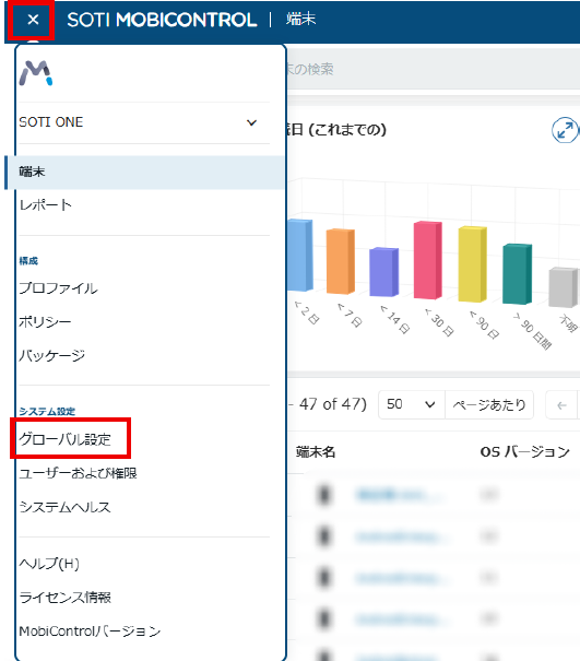 1.管理コンソールを開き左上の[≡]から[グローバル設定]をクリックします。