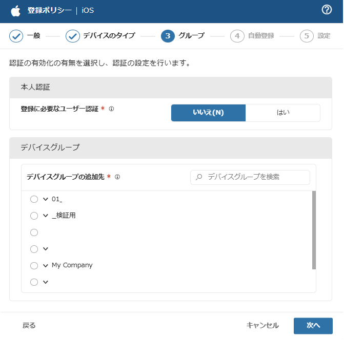 本人認証に[いいえ]を選択、登録先のグループにチェックを入れ[次へ]をクリックします。