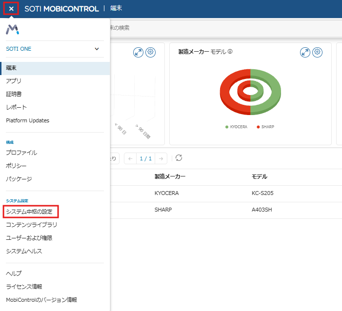 1.管理コンソールを開き左上の[≡]から[システム中枢の設定]をクリックします。